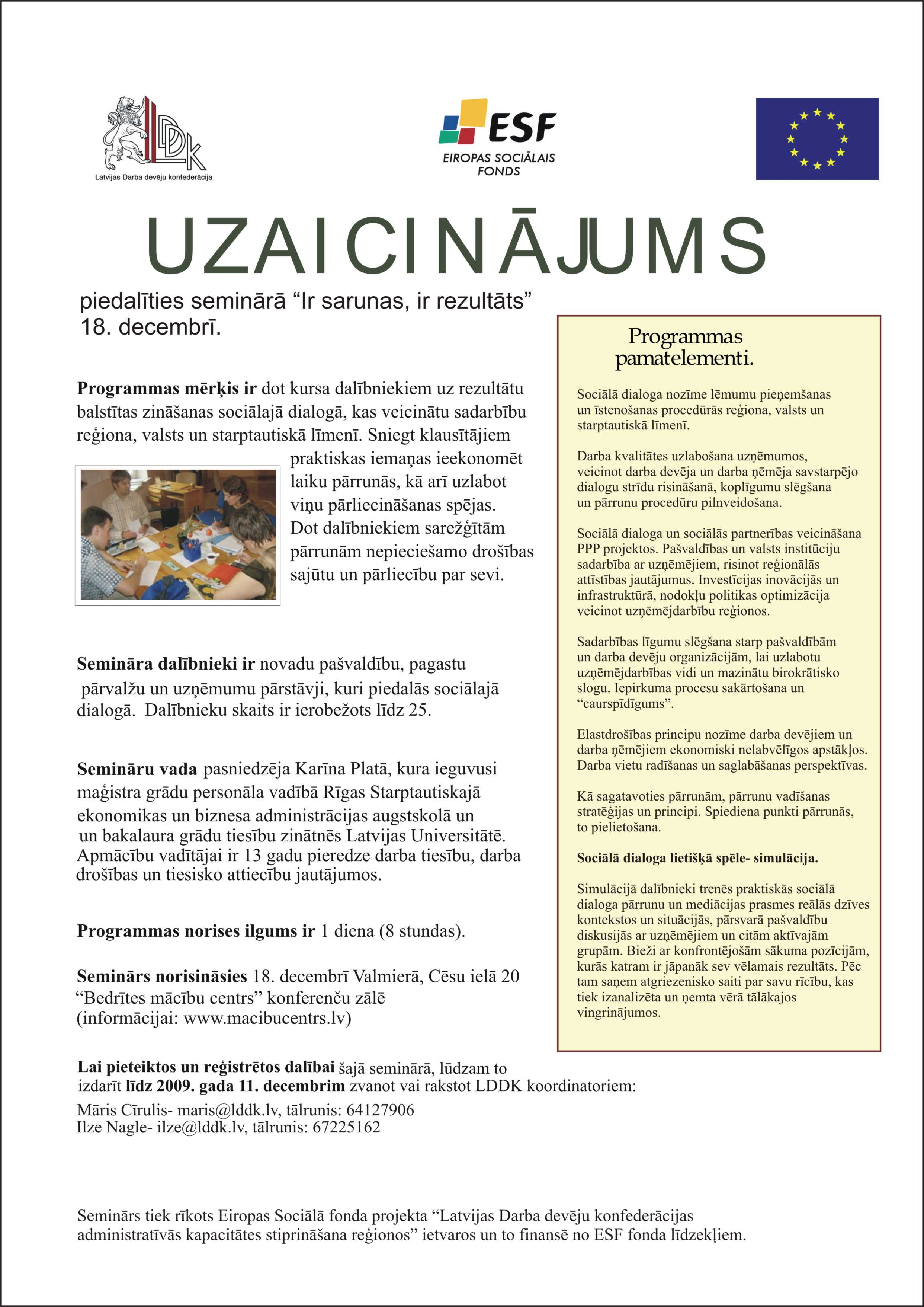 Jaunumi VidzemēValmierā, Cēsu ielā 20, 18.decembrī notiks seminārs par sociālā dialoga veidošanu. Semināru rīko Latvijas darba devēju konfederācija ar Eiropas Sociālā fonda atbalstu. Plašāk par semināra norisi un pieteikšanos lasiet pievienotajā pielikumā šeit. 26.11.2009