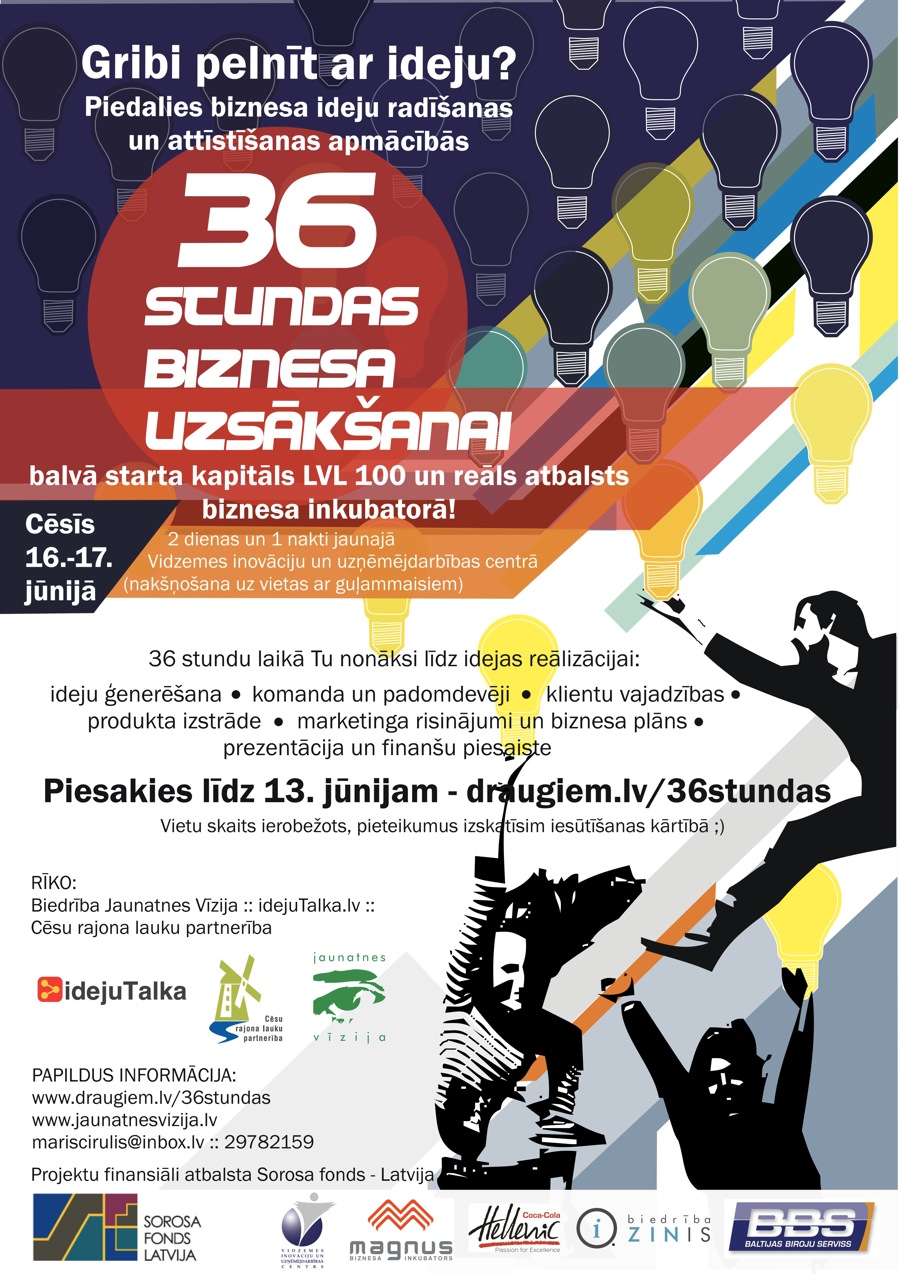 Jaunumi VidzemēBiedrība Jaunatnes vīzija, Cēsu rajona lauku partnerība un idejuTalka.lv rīko 2 dienu apmācības biznesa ideju radīšanai un attīstīšanai "36 stundas biznesa uzsākšanai" Cēsīs 16-17.jūnijā Vidzemes inovāciju un uzņēmējdarbības centrā.