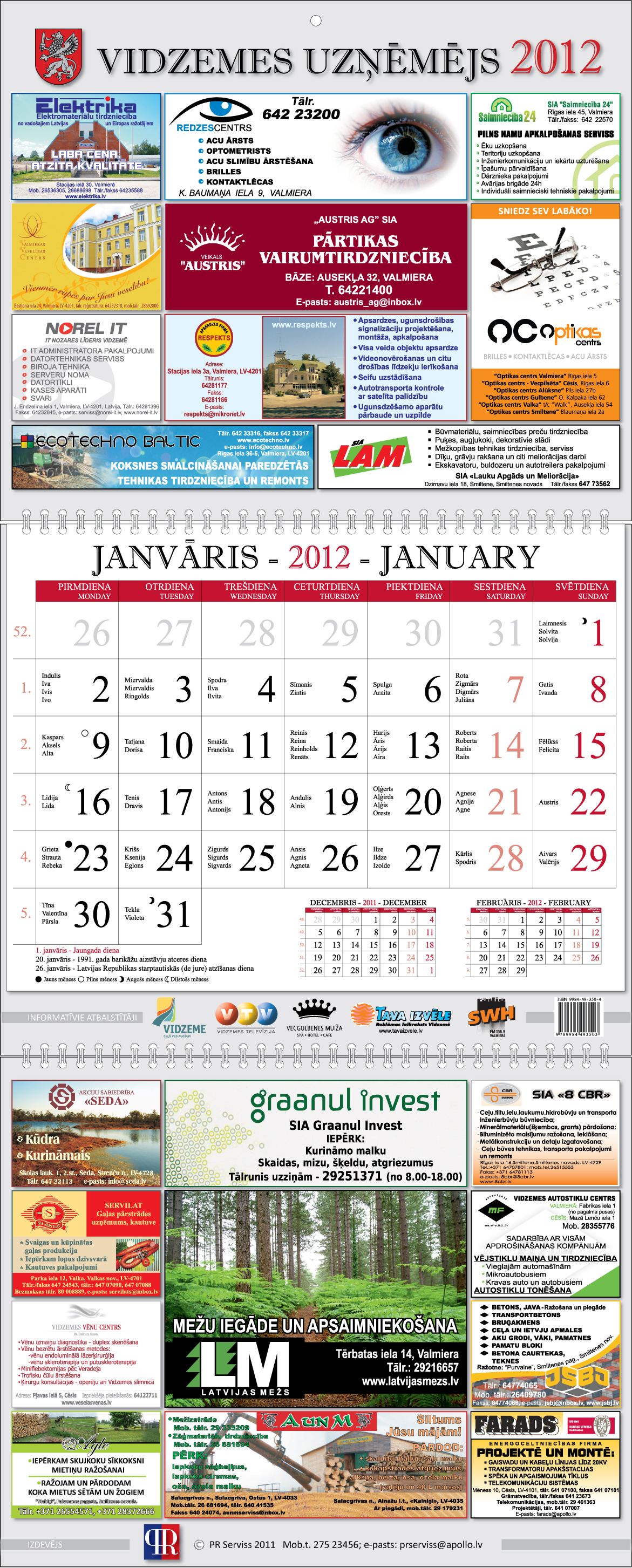 Jaunumi VidzemēIzdevējs „PR Serviss” pateicas Reklāmdevējiem par Kalendāra tapšanai nepieciešamo finansiālo ieguldījumu un informatīvajiem atbalstītājiem par radošu sadarbību. Visiem uzņēmumiem Ziemeļvidzemē, Kalendāra bezmaksas eksemplārs tiks piegādāts līdz šī gada beigām, savukārt Alūksnes, Gulbenes un Madonas novadu uzņēmēji savu Kalendāra eksemplāru varēs saņemt ar Vidzemes Plānošanas Reģiona starpniecību, reģiona organizēto pasākumu laikā, kā arī ierodoties kādā no Vidzemes plānošanas reģionu birojiem (Valmierā, Cēsīs vai Alūksnē). Šī izdevuma mērķis ir nodrošināt visus reģiona uzņēmumus ar kvalitatīvu biroja kalendāra bezmaksas eksemplāru, vienlaikus piedāvājot reklāmdevējiem, lielisku iespēju uzrunāt samērā plašu mērķauditoriju, pastāvīgi un ilgstošā periodā informējot potenciālos un esošos klientus par savas darbības aktualitātēm. Sākumam, vienā izdevumā nepietika vietas un laika, lai spētu apkopot visus veiksmes stāstus, tāpēc, ja arī Jūs uzskatāt par cienīgu, atspoguļot sava uzņēmuma informāciju, kādā no nākošā Kalendāra reklāmas laukumiem,