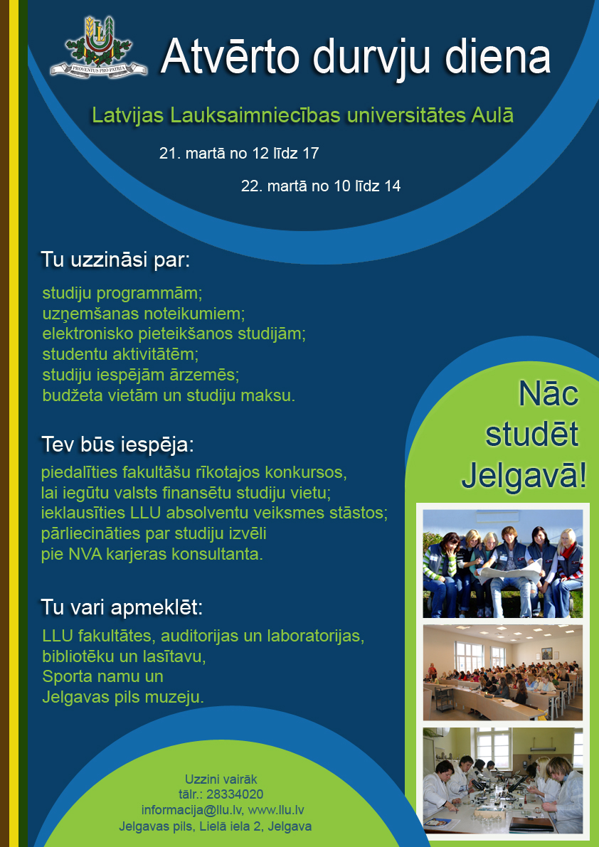 Jaunumi VidzemēLatvijas Lauksaimniecības universitāte (LLU) 21. un 22. martā rīkos Atvērto durvju dienas. Atvērto durvju dienas tiek rīkotas ar vēlmi pēc iespējas plašāk iepazīstināt jauniešus ar universitāti un tās studiju vidi, kur ikvienam būs iespēja apskatīt visu fakultāšu stendus, nepiespiestā gaisotnē iztaujāt studentus un mācībspēkus, uzzināt par studentu ikdienas gaitām, sadzīvi un uzzināt par nākotnes karjeras iespējām kādā no interesējošajām profesijām. Skolēniem tiks piedāvāta iespēja doties ekskursijās uz fakultātēm un apskatīt lekciju telpas, laboratorijas un jaunāko tehnoloģiju iekārtas, kuras tiek izmantotas studiju procesā un studentu praktiskajos darbos. LLU speciālisti sniegs nepieciešamo informāciju par studiju un studējošā kredītiem, kā arī LLU Attīstības fonda piedāvātajām stipendijām un studentu apmaiņas programmām, tostarp ERASMUS. Savukārt, LLU Studentu pašpārvalde, stāstīs par sporta aktivitātēm un pašdarbības iespējām. Pārtikas tehnoloģijas fakultāte un Lauku inženieru fakultāte rīkos speciālus testus-konkursus, kuru rezultātā jauniešiem būs iespēja iegūt budžeta vietu kādā no iepriekšminēto fakultāšu īstenotajām studiju programmām. LLU ir ceturtā lielākā augstskola valstī ar vairāk nekā 60 akreditētām studiju programmām 14 studiju virzienos, no kuriem puse ir unikāli – lauksaimniecībā, mežsaimniecībā, veterinārmedicīnā, pārtikas tehnoloģijās un ainavu arhitektūrā, kas ir nepieciešami speciālisti ikvienā Latvijas reģionā, nodrošinot vienmērīgu tautsaimniecības attīstību valstī. Informāciju sagatavoja: Laura Strēle Latvijas Lauksaimniecības universitātes Sabiedrisko attiecību un karjeras centra projektu vadītāja karjeras jomā tālr. 63005718, 26868158 07.03.2014
