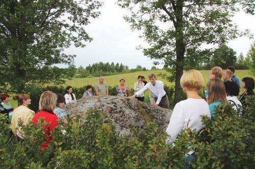 Braucējus pavadīja gids Andris Klepers - Vidzemes Augstskolas lektors un bakalaura studiju programmas „Tūristu gids – ceļojumu un pasākumu organizators” direktors. Dienas pirmajā pusē tika apskatīts Zilaiskalns, Daviņu Lielais akmens, kā arī Burtnieku ezers un tā apkārtne. Andris Klepers zināja stāstīt par visu šo svētvietu lomu latviešu folklorā un mitoloģijā. Gan Zilaiskalns, gan Burtnieku ezers minēti Andreja Pumpura eposā „Lāčplēsis”, par Daviņu Lielo akmeni ir zināmas teikas un nostāsti. Gids uzsvēra, ka mūsdienās, pieaugot starptautiskumam, tūristus aizvien vairāk interesē autentiskais un atšķirīgais katrā vietā. Tālāk ceļš veda uz Atpiļu Upurozolu, kur tā saimnieks Rihards Circenis braucējus uzņēma ar cienastu un stāstiem par vietas vēsturi un nozīmi. Arī Upurozola apkārtnē ir atrodamas liecības par senu svētvietu – tur ir gan Upurakmens, gan vairāki lieli akmens krāvumi un senkapu vietas. Noslēgumā tika apskatīts Sīmanēnu svētozols, kurš ieņem pirmo vietu starp Latvijas visvairāk daudzinātajiem svētozoliem. Brauciena dalībniekiem bija iespēja būt ne tikai vērotājiem, bet arī pašiem iesaistīties katras vietas izzināšanā, baudīt kokles spēli, pīt vainagus un Valmieras muzeja Krājuma nodaļas vadītājas Indras Vīlisteres vadībā uzzināt vairāk par dabā atrodamajām zālītēm, kam bijusi liela nozīme seno latviešu ikdienā. Andris Klepers rosināja arī tūrisma operatorus mudināt apmeklētājus līdzdarboties un iesaistīties, lai tuvāk izprastu, ko senie latvieši darījuši attiecīgajās svētvietās, tā labāk sajūtot vietas būtību un nozīmi. Brauciena dalībnieki pie Daviņu Lielā akmens. Atgādinām, ka Vidzemes plānošanas reģions izdevis tūrisma ceļvedi - bukletu „Senās dabas svētvietas - VIDZEME” latviešu un angļu valodā. Ceļvedī apkopoti maršruti un informācija par nozīmīgākajām Vidzemes senajām dabas svētvietām. Izveidotais ceļvedis tūristiem pieejams Vidzemes plānošanas reģiona pašvaldību tūrisma informācijas centros un citās tūristu bieži apmeklētās vietās (viesu nami, viesnīcas, atpūtas bāzes, dabas parki, muzeji u.c.). Ar ceļveža “Senās dabas svētvietas – VIDZEME” elektronisko versiju latviešu valodā variet iepazīties šeit. Ar svētvietu maršrutiem var iepazīties arī virtuālajā muzejā www.ancientsites.eu, kur muzeja apmeklētājiem ir iespēja pašiem izstrādāt savus maršrutus, kā arī uzzināt vairāk informāciju par svētvietu objektiem. Papildu informācija: Olita Landsmane, Projekta vadītāja Vidzemes plānošanas reģionā, Mob.: +37129171020, E-pasts: mara.poikane PIE vidzeme PUNKTS lv,www.ancientsites.eu, veca.vidzeme.lv 1.jūlijā noslēdzās pašvaldību pieteikšanās konkursam „Eiropas Gada pašvaldība 2013”. Vidzemes plānošanas reģionā pieteikumi iesniegti no Amatas novada, Valmieras pilsētas, Alūksnes novada un Mazsalacas novada. Pirmā kārta tiek organizēta sadarbībā ar Kurzemes plānošanas reģionu, Zemgales plānošanas reģionu, Rīgas plānošanas reģionu, Latgales plānošanas reģionu un Vidzemes plānošanas reģionu. Katrā plānošanas reģionā ir izveidota vērtēšanas komisija, kas līdz augusta vidum vērtēs pašvaldības pēc iesniegtajām pieteikuma anketām un citiem kritērijiem. Trīs labākās pašvaldības no katra plānošanas reģiona tiks izvirzītas otrajai kārtai valsts mēroga konkursā. 15 pašvaldības sacentīsies otrajā kārtā, līdz 18.oktobrī svinīgā apbalvošanas ceremonijā tiks sumināti visi konkursanti.